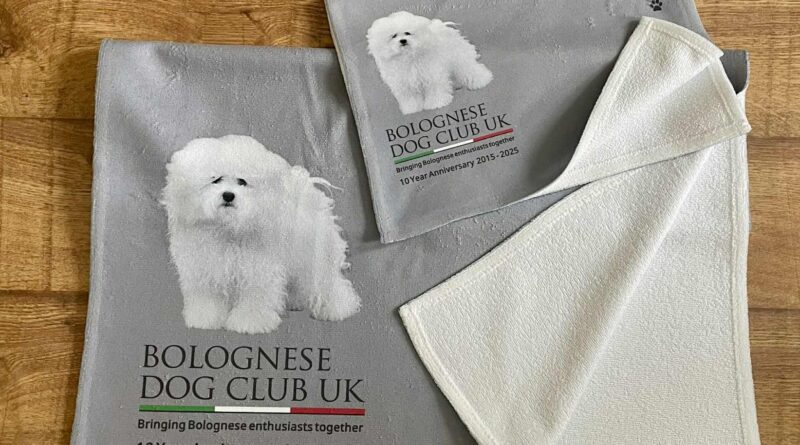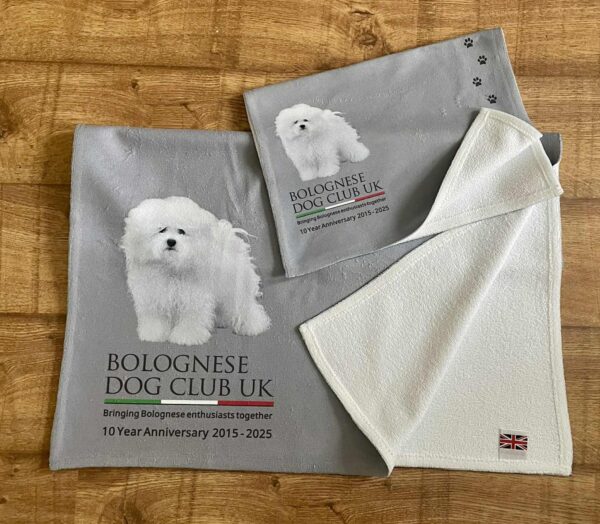 We are so happy to launch our 10-year Anniversary Microfiber Towels in 2 sizes. We have chosen a universal grey colour which shows off the beautiful Bolognese Dog image amazingly. We have also included paw print designs down one side. The large towel is classed as a bath/small beach size and is 70 x 140cm and the smaller towel Gym/Tea Towel at 40 x 60cm. The large towel is plenty big enough for drying a very wet small to medium size dog, it’s very absorbent, washes well and dries quickly. Ideal for using at home, in the car or away on holiday. The towels are made in the UK portraying a union jack label.