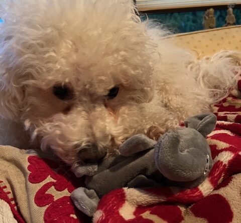 Luca was so funny with his new birthday toy. He took it right away and started chewing and enjoyed the noise it made. Then he demanded food – ate it all , played a bit more and is now snug in his bed, prior to a nice walk. I did make a cake for him from a recipe I found- peanut butter and banana. Have no idea if he will like it. The frosting is yogurt and peanut butter. If he doesn’t eat it , at least we can!